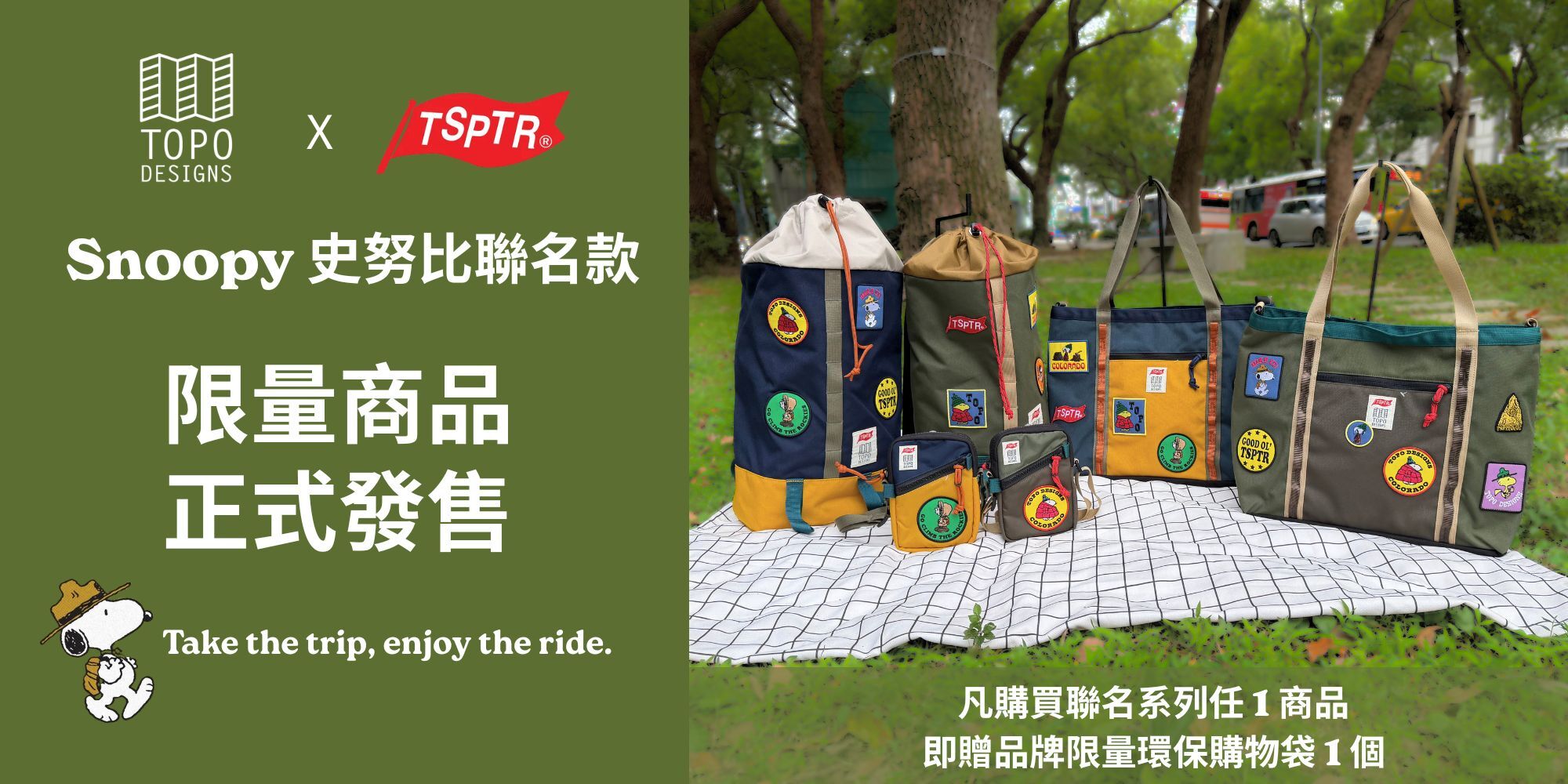 🐾 Topo Designs × TSPTR Snoopy 聯名系列|正式發售Topo Designs 與英國品牌 TSPTR 聯手打造的 Snoopy 聯名限定系列今天正式上市。此次合作以 TSPTR 特別設計的 Peanuts 布章為亮點, 將 Topo Designs 的機能設計與漫畫史奴比經典角色完美融合。每一個包款皆以細緻工藝呈現 Snoopy 的幽默、冒險精神與簡單的快樂! Topo Designs x TSPTR Cosmos Backpack 星空背包 限量款Topo Designs x TSPTR Mountain Utility Tote 山系托特包 限量款Topo Designs x TSPTR Mini Shoulder Bag 迷你肩背包 限量款